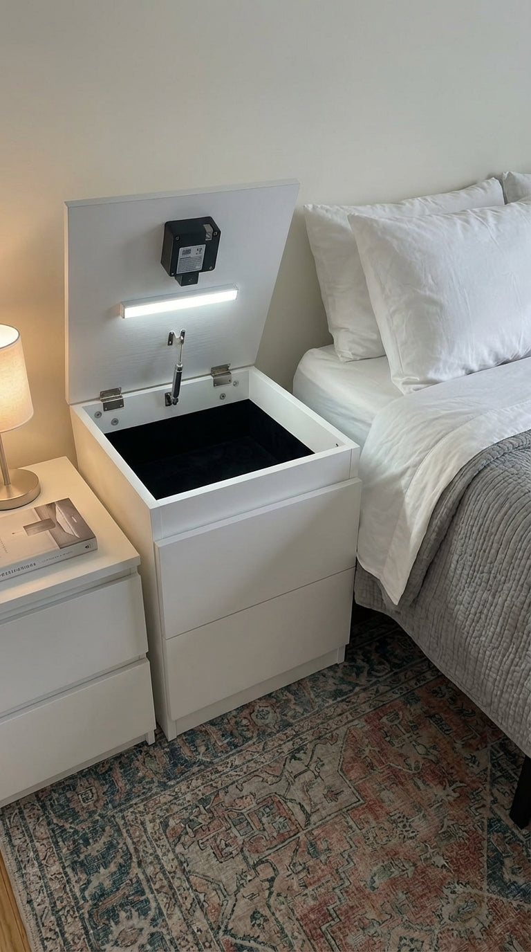 A discreet NFC card (no batteries needed) unlocks your drawer with a quiet blip sound. No fumbling for keys – just tap and access your hidden stash in seconds.